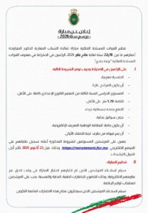 كما أكدت القوات المسلحة الملكية أن المترشحين المقبولين أولياً سيخضعون لمراحل انتقاء تشمل الفحوص الطبية والاختبارات البدنية والنفسية، قبل استدعاء الناجحين منها لمتابعة التكوين العسكري.