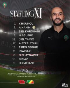 ياسين بونو – أشرف حكيمي (قائد) – سليم الكرواني – نايف أكرد – جواد الياميق – عبد الصمد الزلزولي – إلياس بن صغيّر – إسماعيل صيباري – نبيل أيناوي – إبراهيم دياز – هيثم إجمانة.