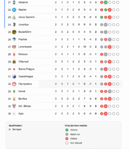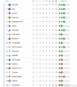 يتصدر باريس سان جيرمان الترتيب برصيد 9 نقاط كاملة بعد ثلاثة انتصارات متتالية، مسجلاً 13 هدفًا مقابل 3 أهداف فقط في مرماه، ليؤكد أنه أحد أبرز المرشحين للقب هذا الموسم، خصوصًا بعد فوزه الكبير على باير ليفركوزن (7-2) في الجولة الأخيرة.