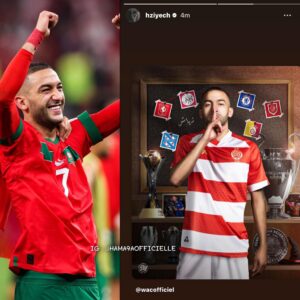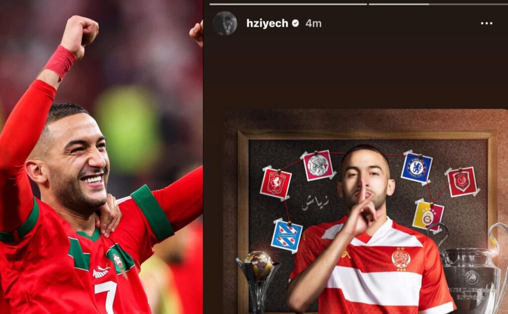 أعلن النجم المغربي حكيم زياش، بشكل رسمي، انتقاله إلى نادي الوداد الرياضي، وذلك من خلال منشور قصير (ستوري) على حسابه الرسمي بموقع إنستغرام، وضع فيه شعار النادي الأحمر مرفقًا بعبارة تعبر عن حماسه للعودة إلى البطولة الوطنية.