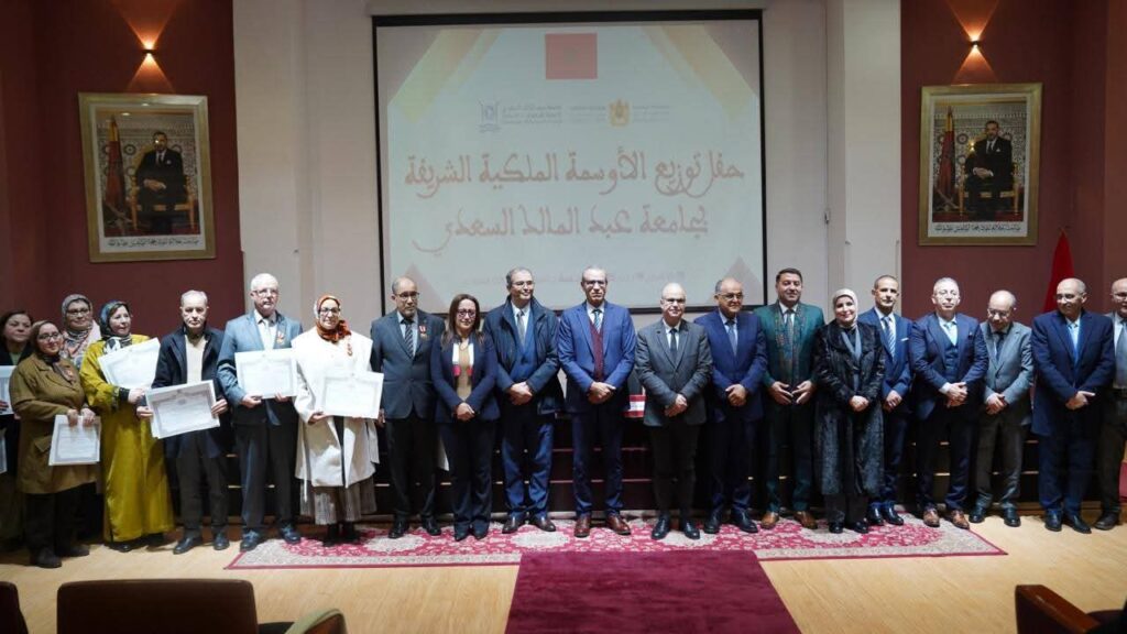 احتضنت جامعة عبد المالك السعدي، يوم الخميس 19 دجنبر 2025، حفلًا رسميًا بهيجًا خُصّص لتوشيح نخبة من الأساتذة الباحثين والأطر الإدارية والتقنية بالأوسمة الملكية الشريفة، التي أنعم بها الملك محمد السادس، تقديرًا لما أسدوه من خدمات جليلة، واعترافًا بمساراتهم المهنية المشرفة وتفانيهم في خدمة الجامعة والوطن.