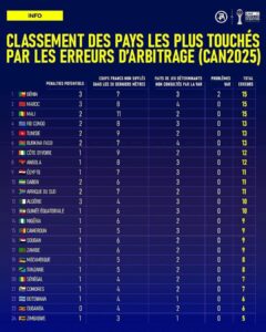 وبحسب نفس المعطيات، حل منتخب بنين في صدارة المنتخبات الأكثر تضررًا، يليه المنتخب المغربي في المرتبة الثانية، متقدمًا على عدة منتخبات وازنة شاركت في البطولة، ما أعاد إلى الواجهة النقاش حول مستوى التحكيم ونجاعة استخدام تقنية VAR خلال النسخة الحالية من المسابقة القارية.