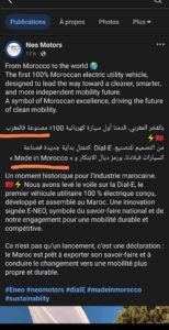 ففي منشورات رسمية على صفحاتها باللغات العربية والفرنسية والإنجليزية، قدّمت الشركة سيارتها على أنها “أول سيارة كهربائية مغربية 100% مصنوعة في المغرب”، مؤكدة أن النموذج الجديد يمثل «فخر الصناعة الوطنية» و«رمز الابتكار المغربي». وأضافت أن المشروع يشكّل «لحظة تاريخية في مسار الصناعة المغربية»، وأن المملكة أصبحت «جاهزة لتصدير خبرتها نحو سوق التنقل المستدام».